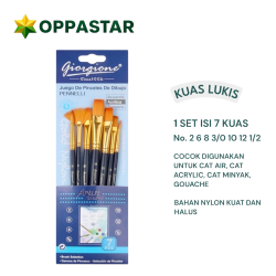 Kuas lukis set dari Giorgione, kuas dengan bulu sintetis nilon. Tangkai kuas berwarna, cocok digunakan untuk berbagai media lukis seperti cat air, akrilik, minyak atau Gouache.  Paket ideal bagi seniman hobi, pelajar seni atau sebagai tambahan koleksi kuas Anda.